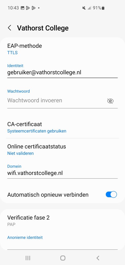 Ga op je Android-apparaat naar je WiFi-instellingen en selecteer Vathorst College en vul de velden in zoals hieronder getoond: